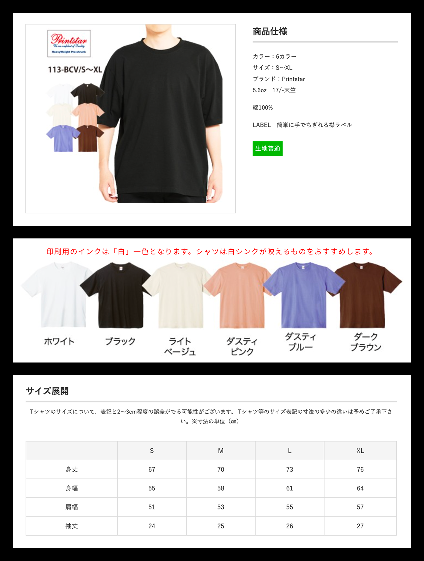 ◯印刷用インクは白1色となりますので、Tシャツは白インクが映える色を推奨します。